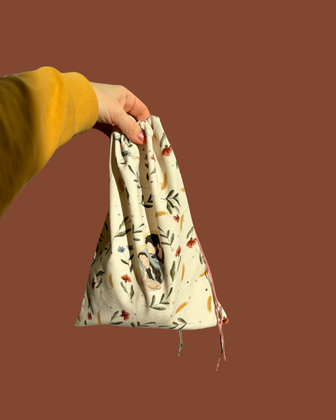 Sprawdzi się jako worek na drobiazgi, kosmetyki, książeczkę, różaniec, przekąski albo „mamusiowe przydasie”.