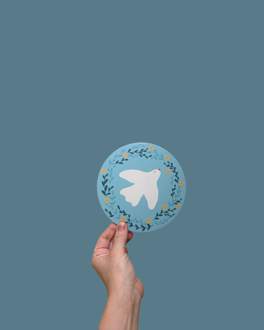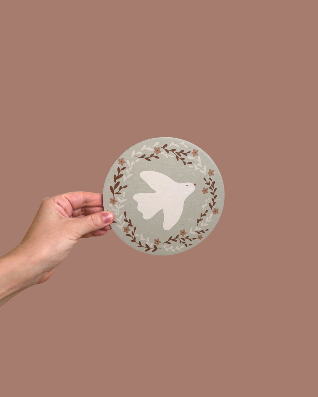 Piękna, minimalistyczna ozdoba z symbolem Ducha Świętego otulonego wieńcem symbolizującym pokój i dobro.