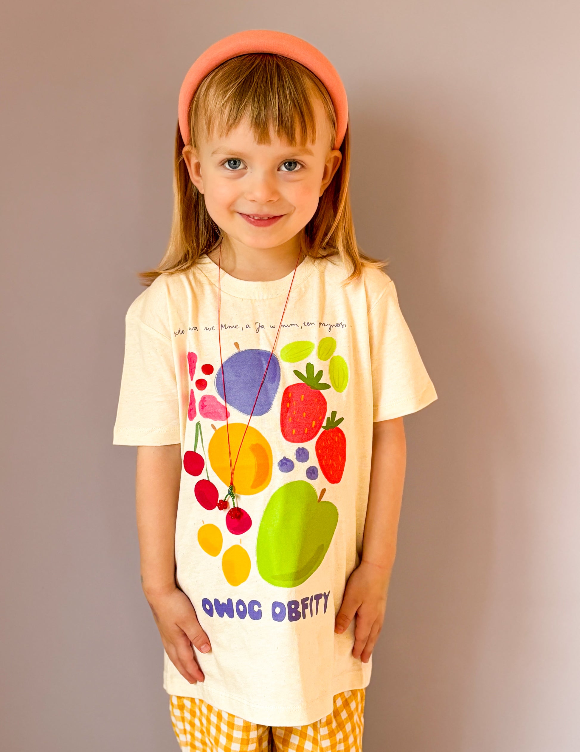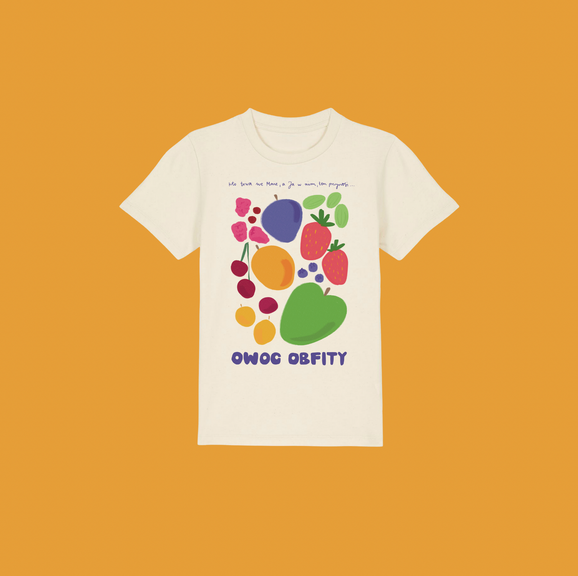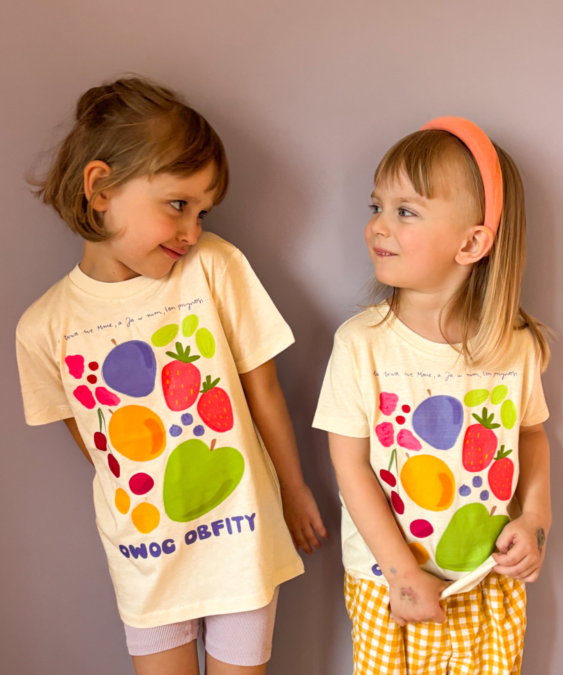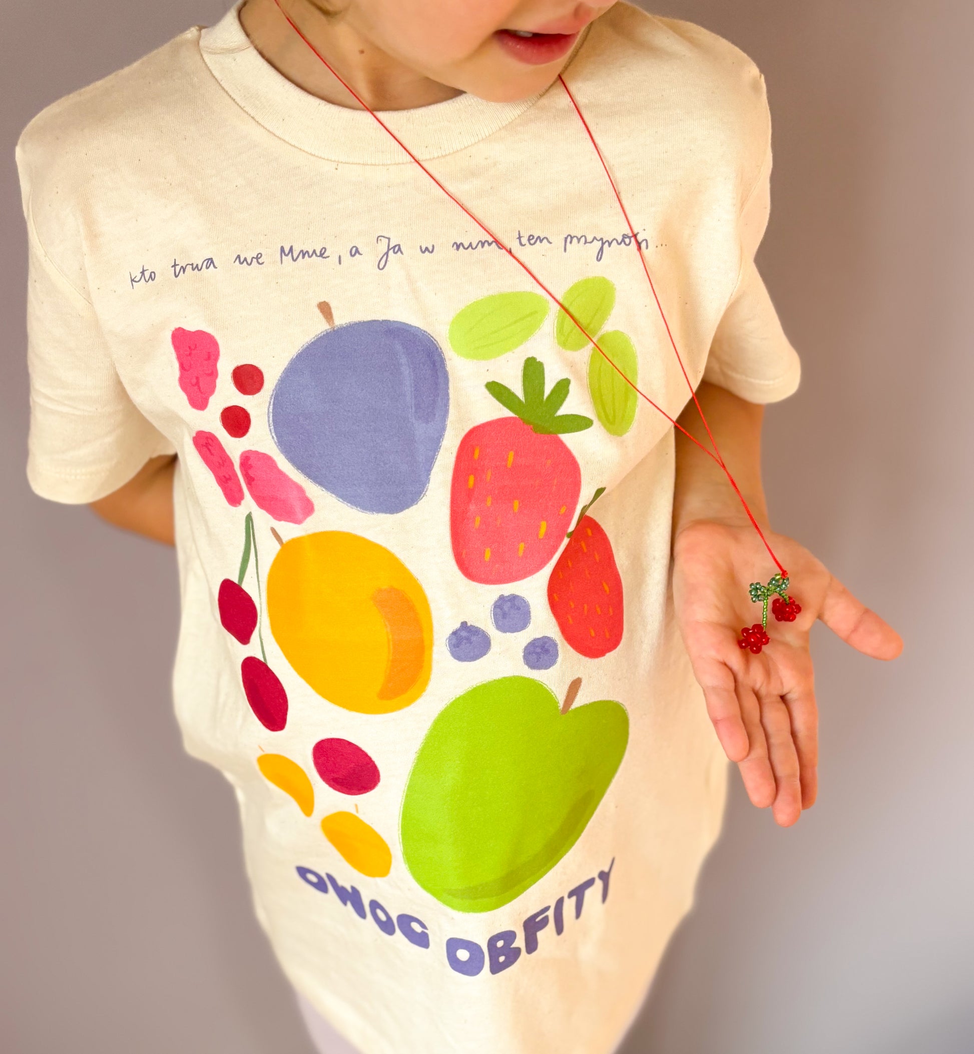 Koszulka w wersji dla dorosłego ma na piersi mały nadruk- wisienki, z kolei na plecach całą grafikę „Owoc obfity” 🍒 W wersji dziecięcej nadruk znajduje się na przodzie.