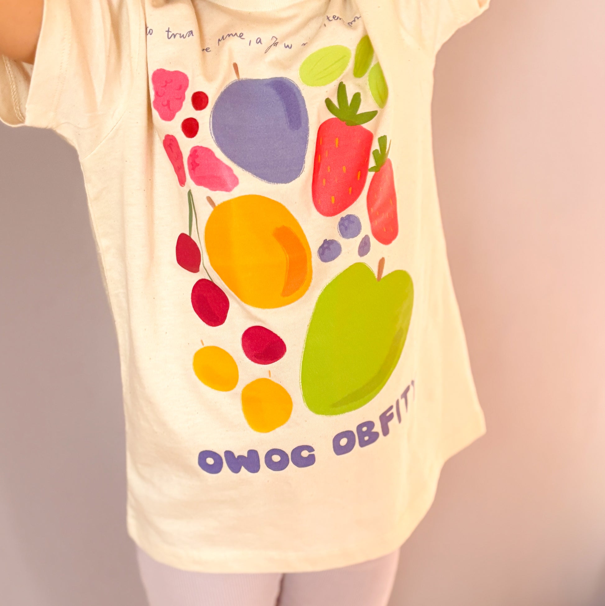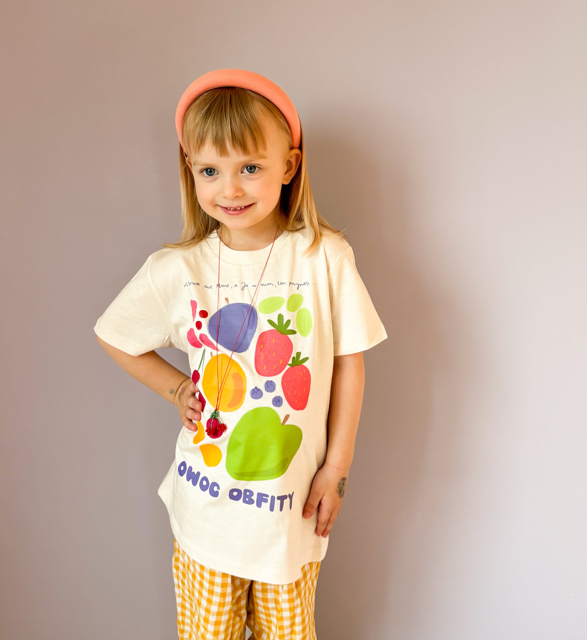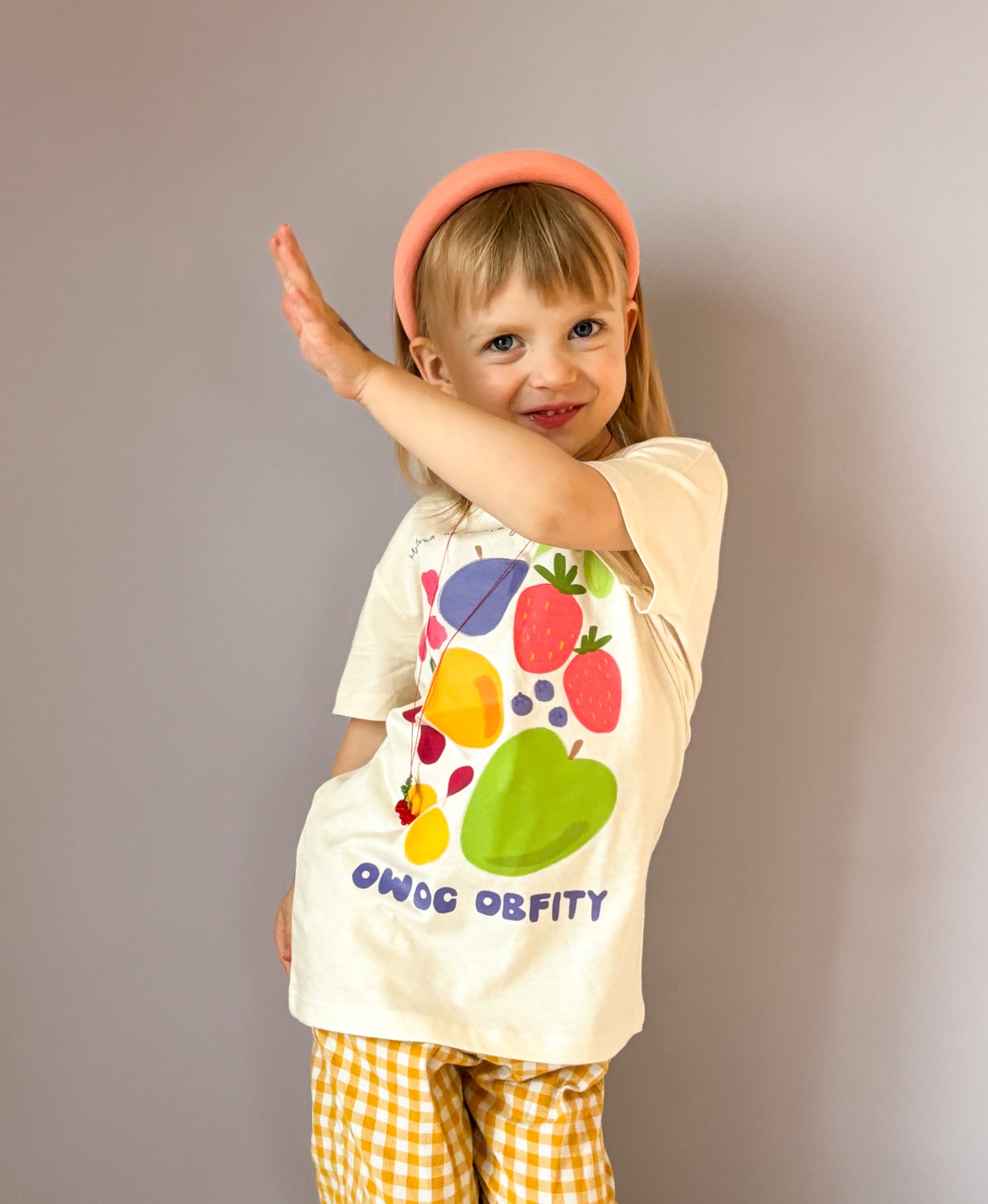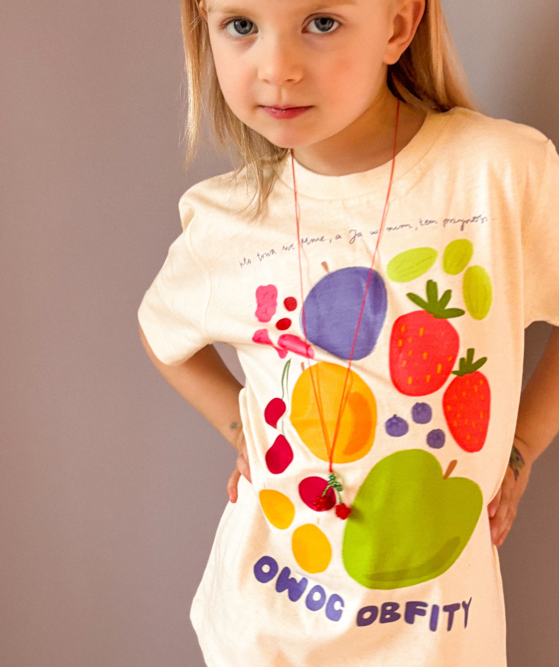 Koszulka w wersji dla dorosłego ma na piersi mały nadruk- wisienki, z kolei na plecach całą grafikę „Owoc obfity” 🍒 W wersji dziecięcej nadruk znajduje się na przodzie.