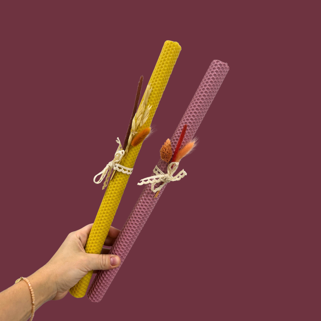 Świece mają wysokość około 40 cm i 3 cm średnicy i delikatne przybranie w formie mini bukieciku z kwiatowego suszu i bawełnianej koronki.