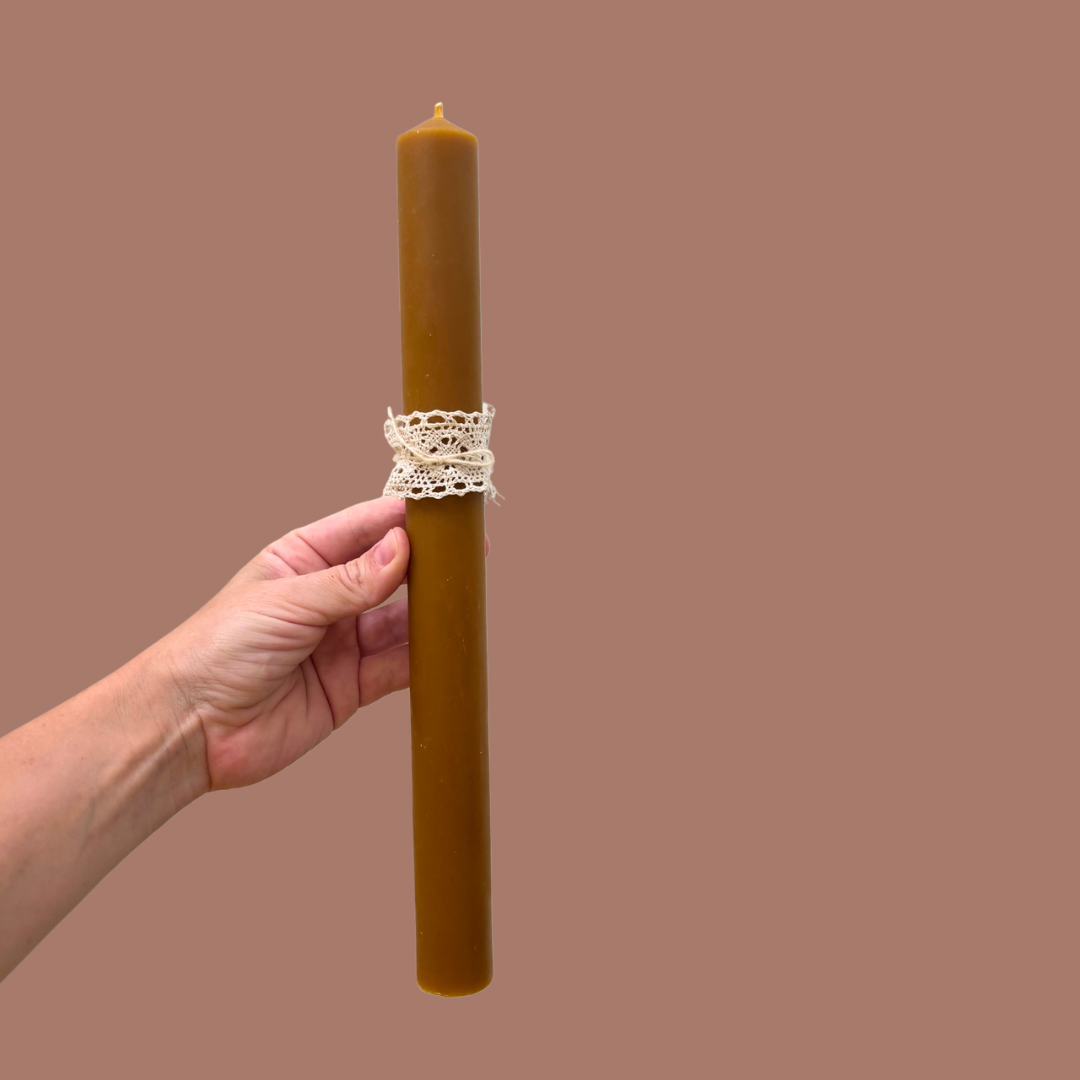 Prosta, ale pełna symboliki. Ręcznie odlewana z naturalnego wosku pszczelego — pachnie miodem, spokojem i tradycją.