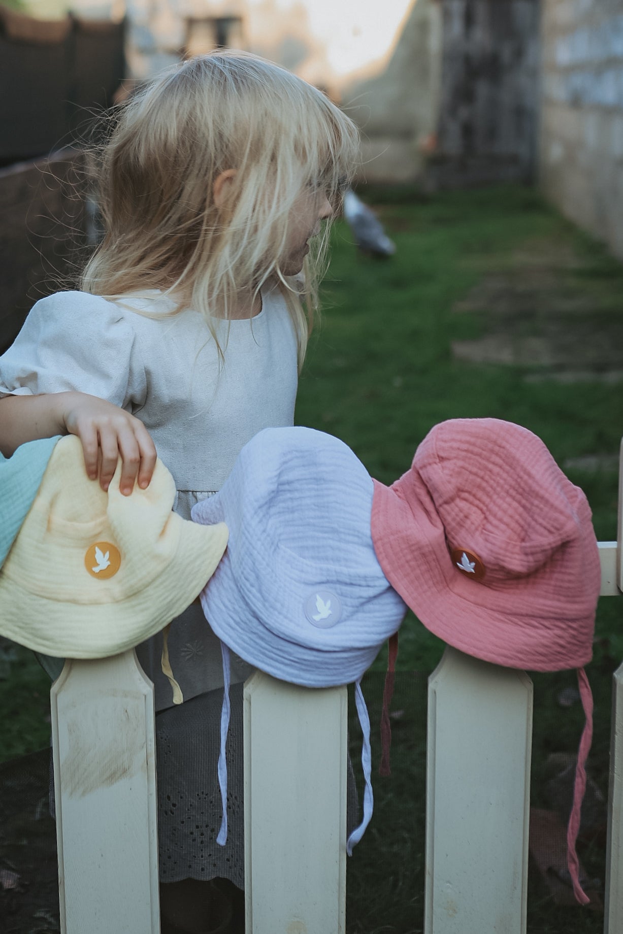 Muślinowe bucket hat dla małych wakacjuszy! Lekkie i przewiewne, wiązane pod szyją- bo doskonale wiemy że bobasy czują wakacyjną misję zdejmowania czapek i rzucania daaaaleko 🤪