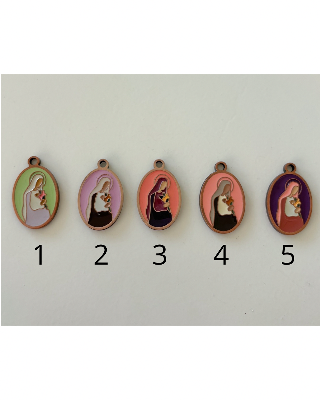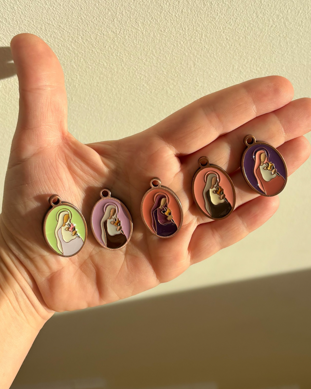 Medaliki wykonane są z mosiądzu w kolorze rose gold każdy zawieszony jest na woskowanym sznurku z możliwością regulacji - żeby zdjąć medalik ze sznurka wystarczy go rozwiązać.