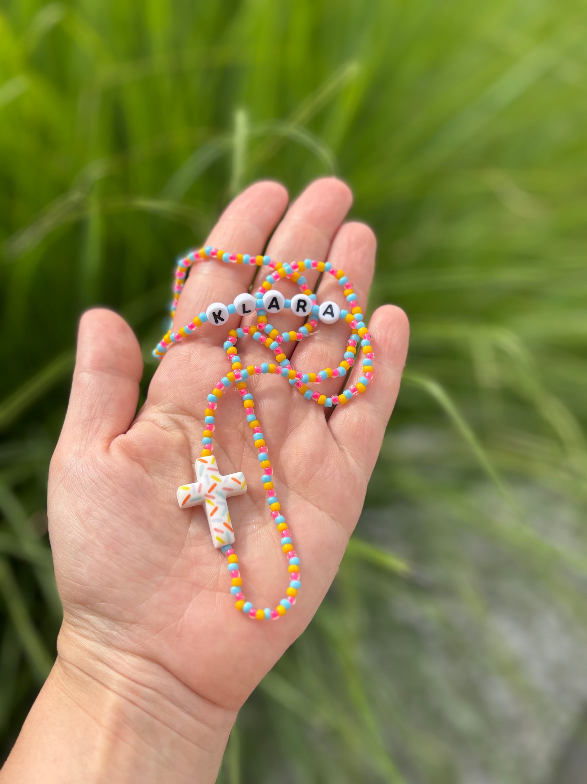 Koraliki wykonane są z tworzywa, krzyżyk z lakierowanej glinki polimerowej, malowany ręcznie, a całość zgrabnie prezentuje się na szyi gdyż… elastyczna żyłka dba by łatwo było go założyć i zdjąć 🤪
