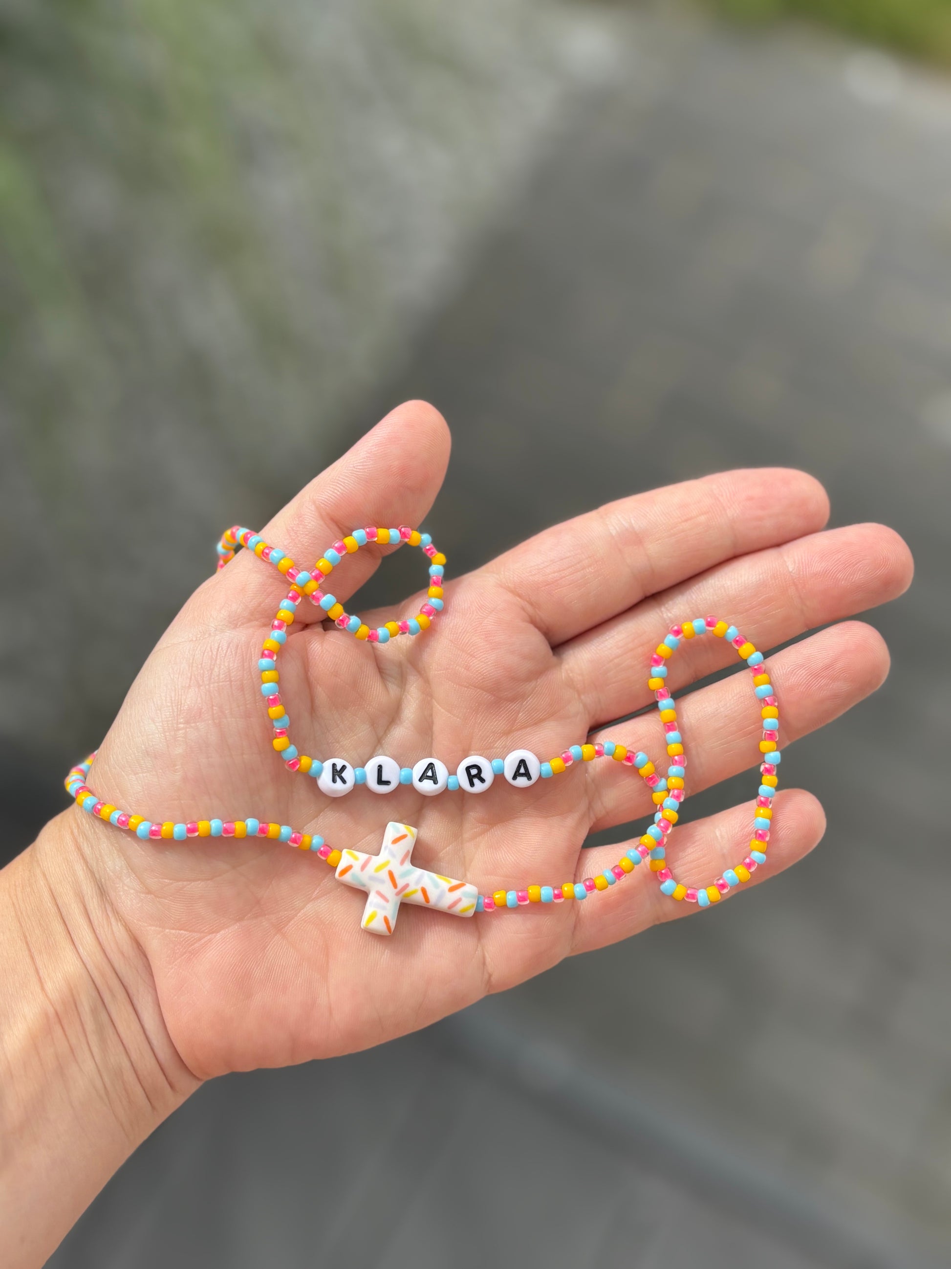 Personalizacja- chcesz dodać imię ułożone z koralików? Potrzebujesz inną długość ? - nie ma problemu! Możemy spersonalizować dla Ciebie naszyjnik z Radosnym krzyżem 💛 tylko uzbrój się w cierpliwość, potrzebujemy na to około 2 tygodnie + wysyłka 🥳