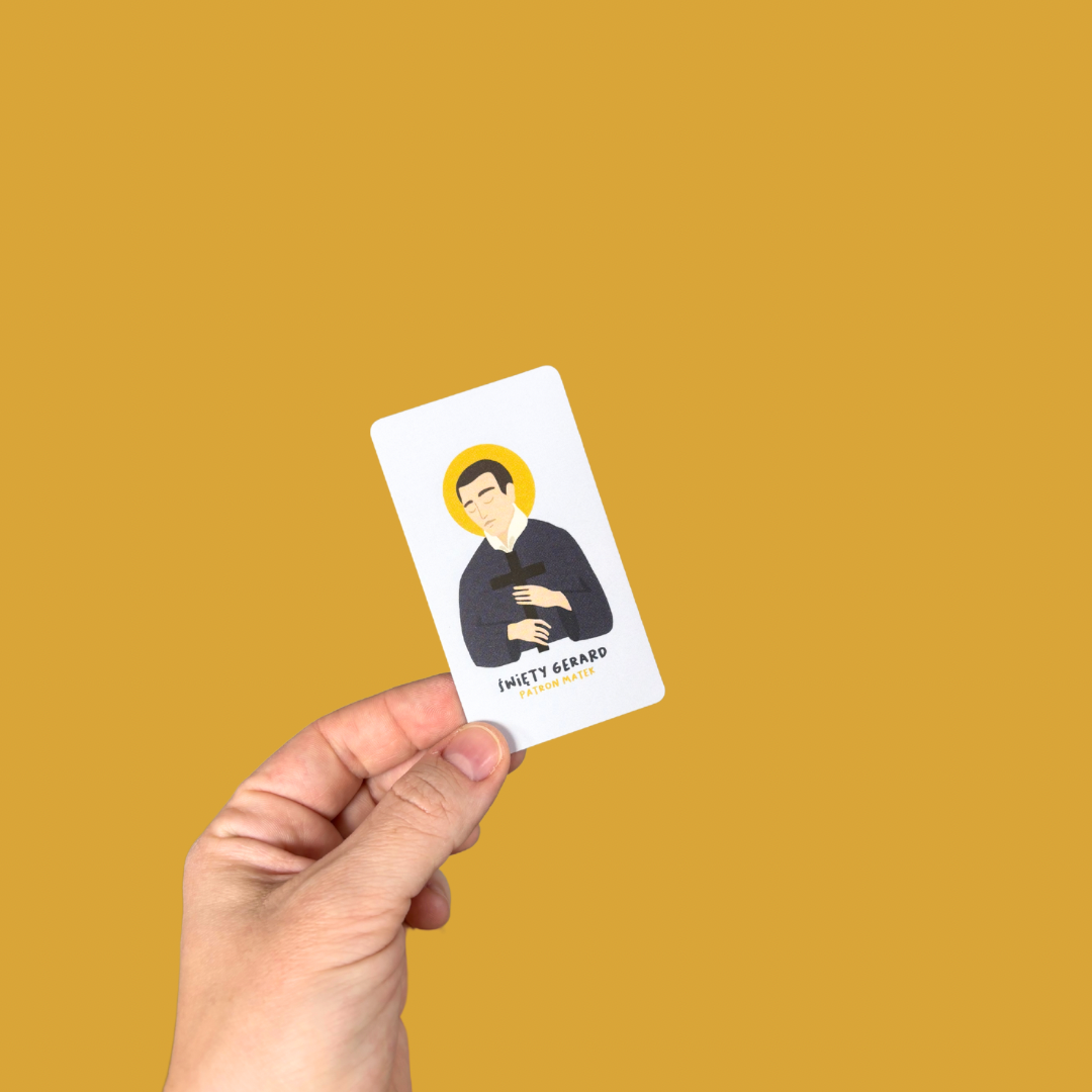 Ten kieszonkowy obrazek to duchowe wsparcie dla przyszłych mam – z jednej strony znajduje się wizerunek Świętego Gerarda autorstwa Leny Krotowskiej-Bugzel, a z drugiej strony piękna modlitwa o dobry poród. 🙏