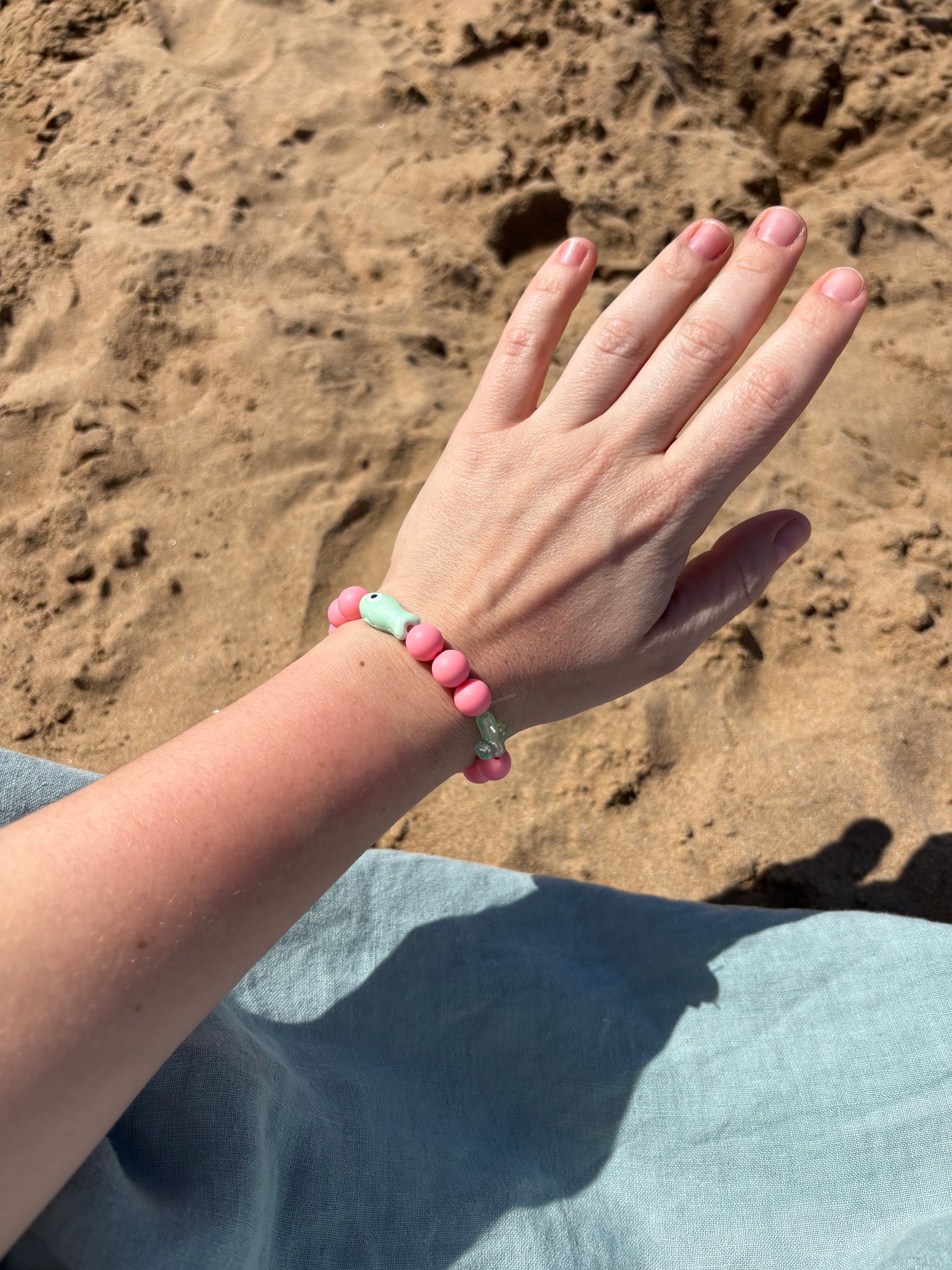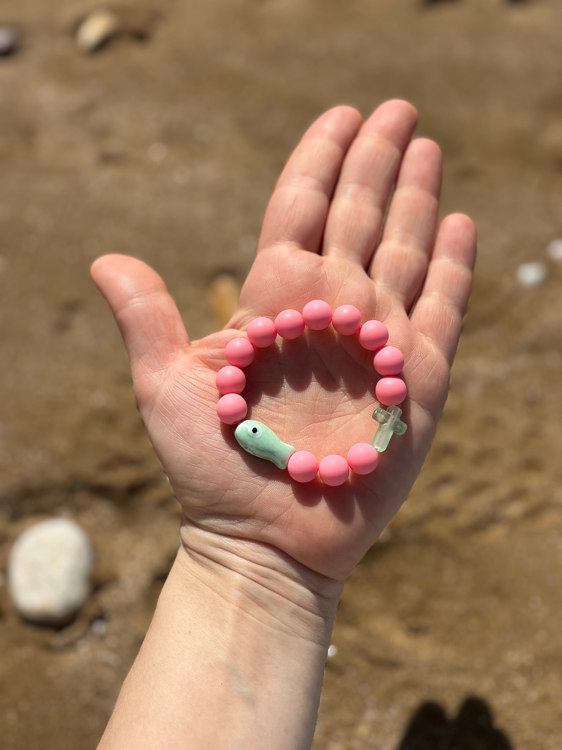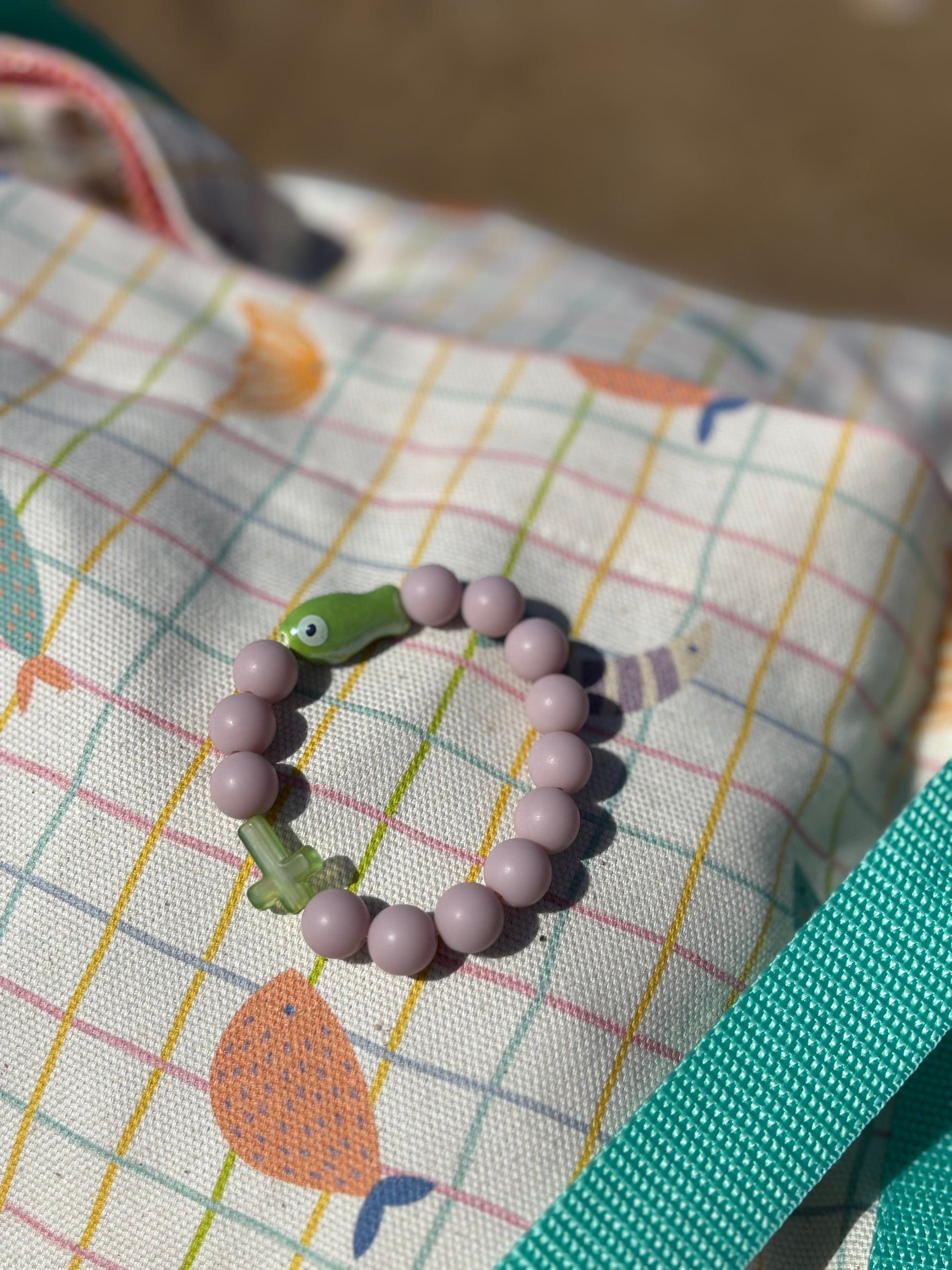 Pastelowe kolory (fiolet, róż i niebieski) spotykają się tu z subtelnym, morskim akcentem – ceramicznym koralikiem w kształcie rybki. Efekt? Coś pięknego, delikatnego i zdecydowanie niebanalnego. Taki detal, który przyciąga spojrzenia… ale nie krzyczy 😉