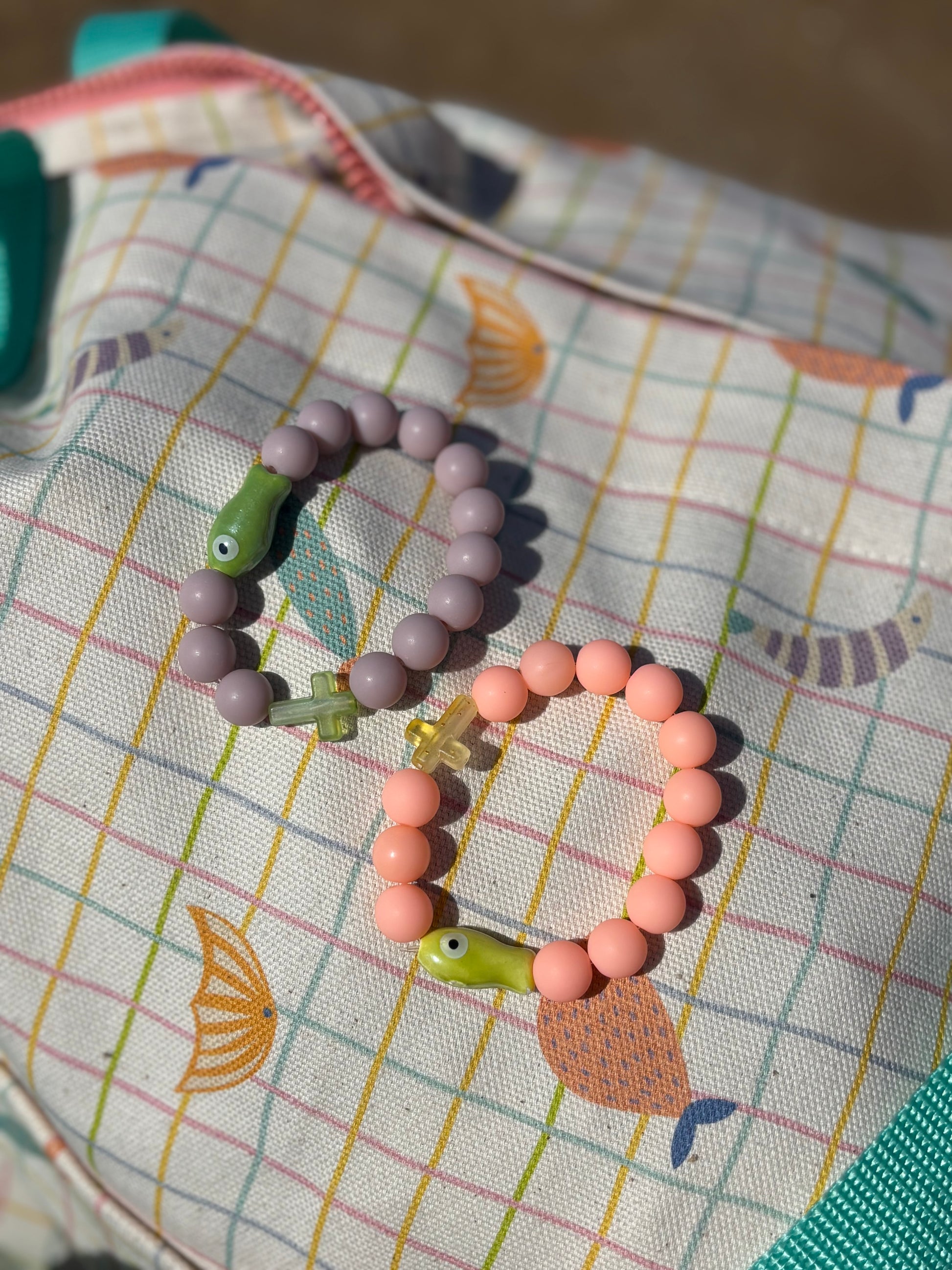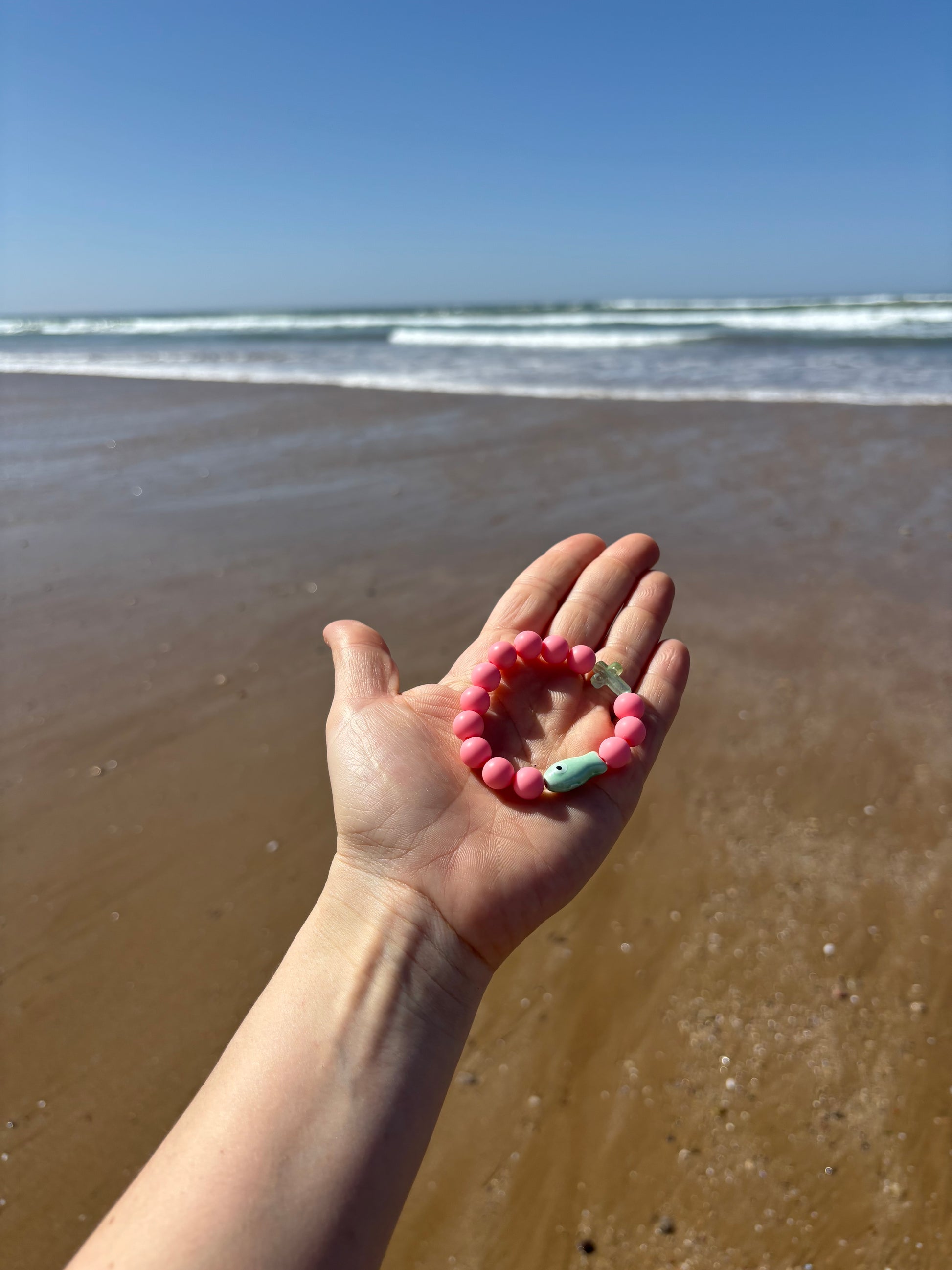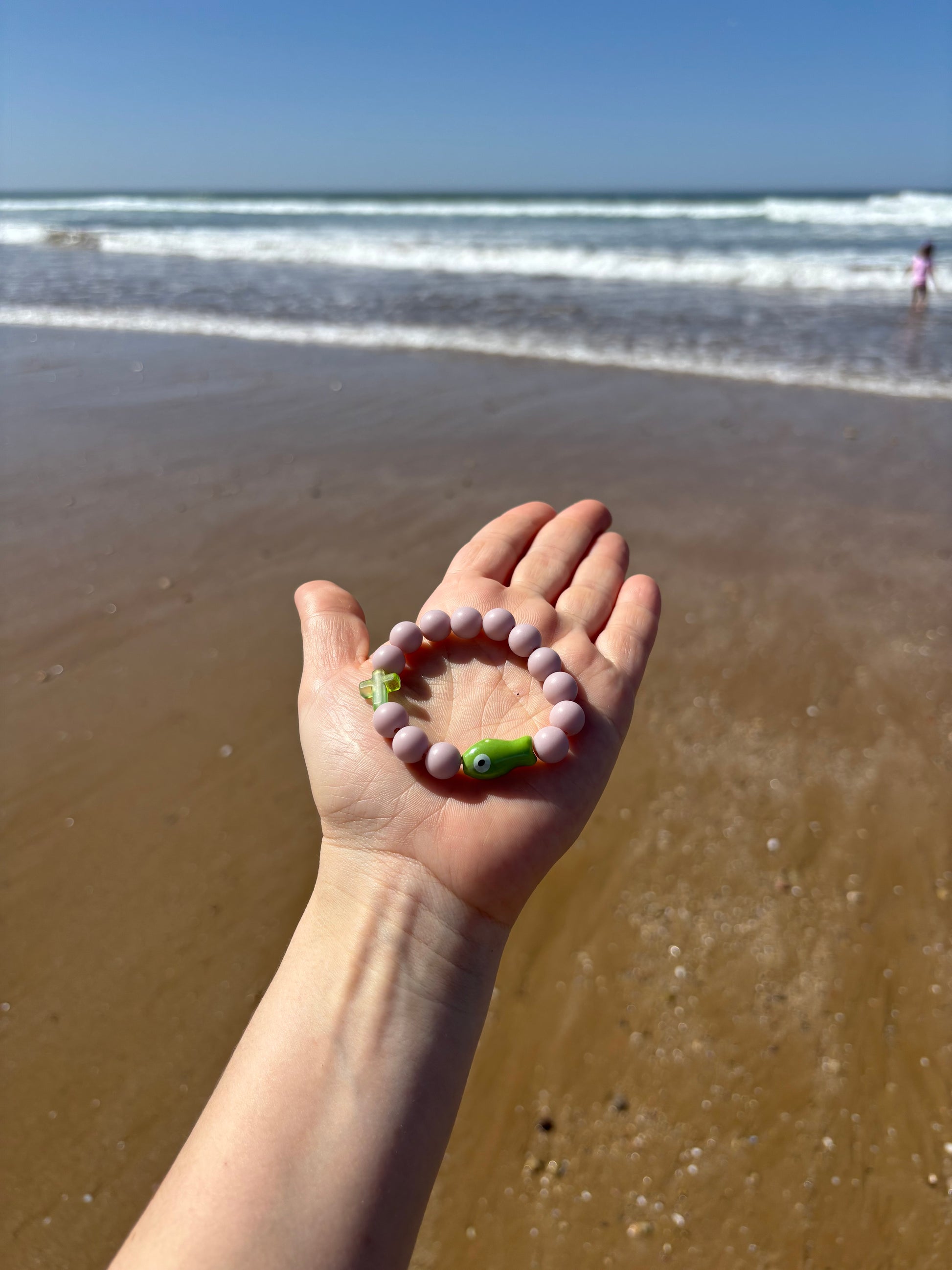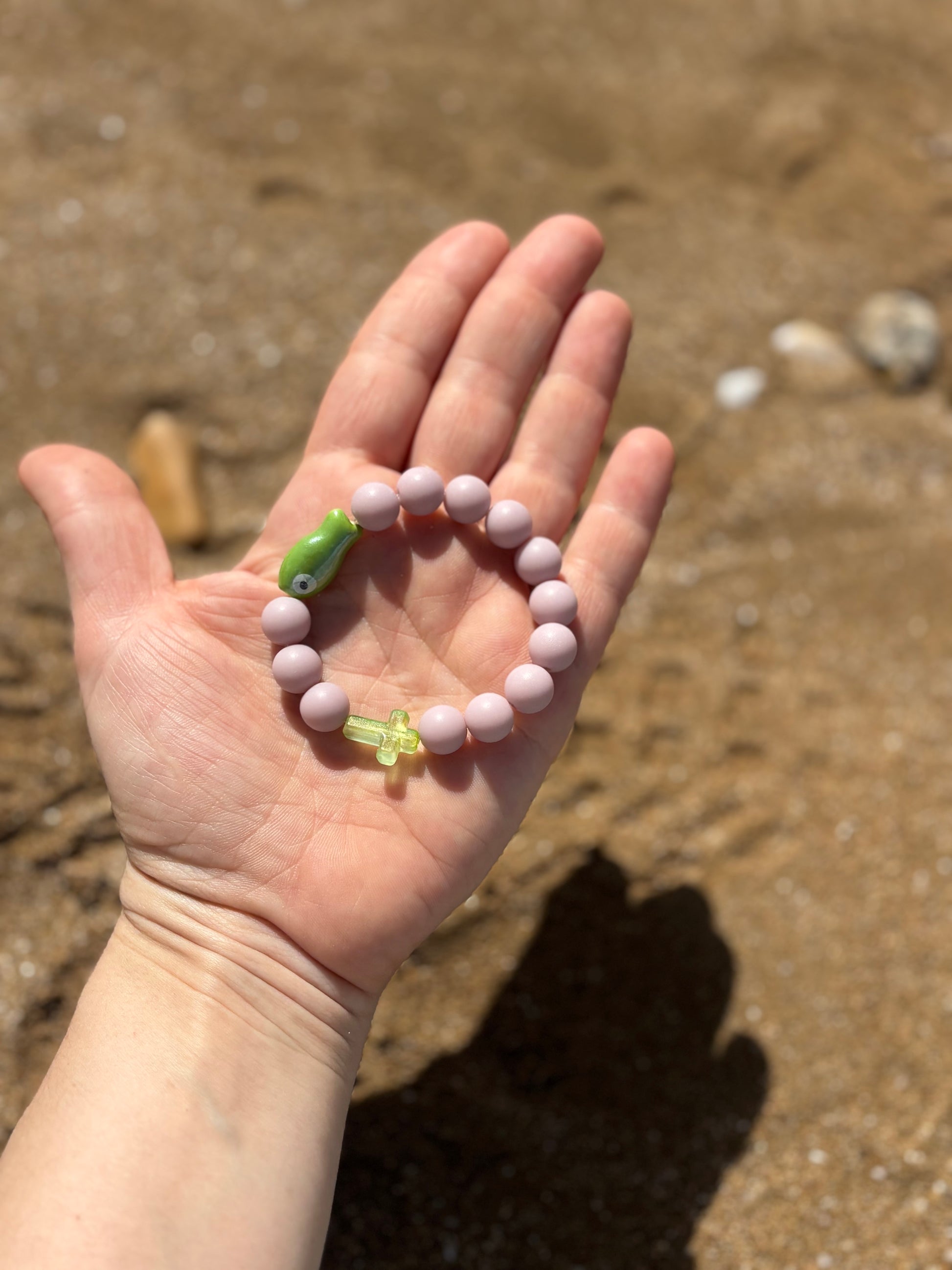 Pastelowe kolory (fiolet, róż i niebieski) spotykają się tu z subtelnym, morskim akcentem – ceramicznym koralikiem w kształcie rybki. Efekt? Coś pięknego, delikatnego i zdecydowanie niebanalnego. Taki detal, który przyciąga spojrzenia… ale nie krzyczy 😉